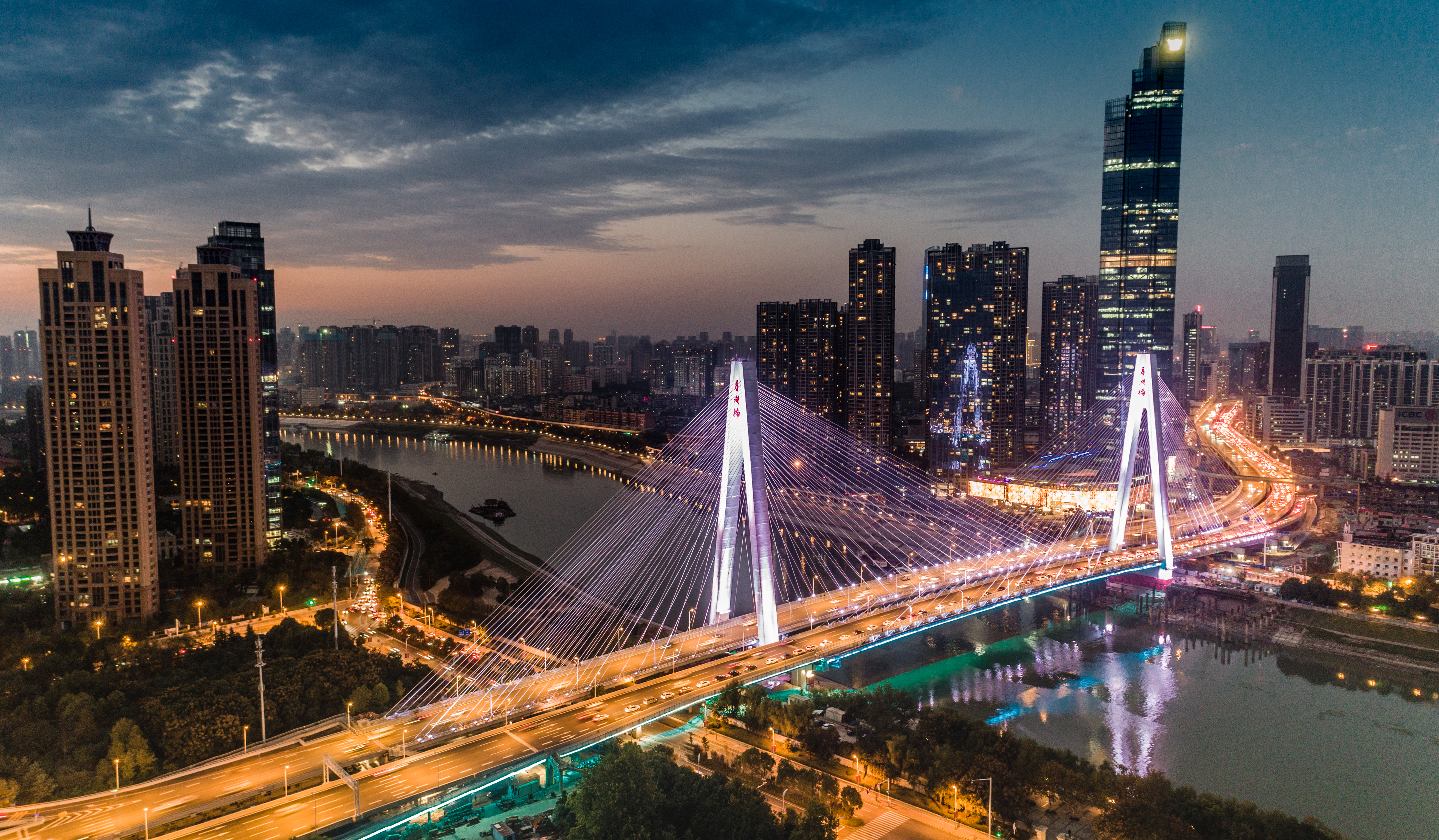 江漢四橋工程南起漢陽梅子山通道,北至漢口京漢大道,全長約1.86KM,主線按城市快速路標準建設,設計時速60KM∕h、設雙向6車道,地面輔道按城市次干路標準建設,設計時速40KM∕h、設雙向4-6車道。工程內(nèi)容主要包括:拓寬既有梅子山通道、新建江城大道下穿琴臺大道地下通道、在既有月湖橋下游新建一幅跨江大橋及兩岸引橋、新建琴臺大道上跨江城大道高架橋,以及相配套的人行天橋、通道、道路排水、交通、綠化、照明等工程。項目于2018年8月31日建成通車。