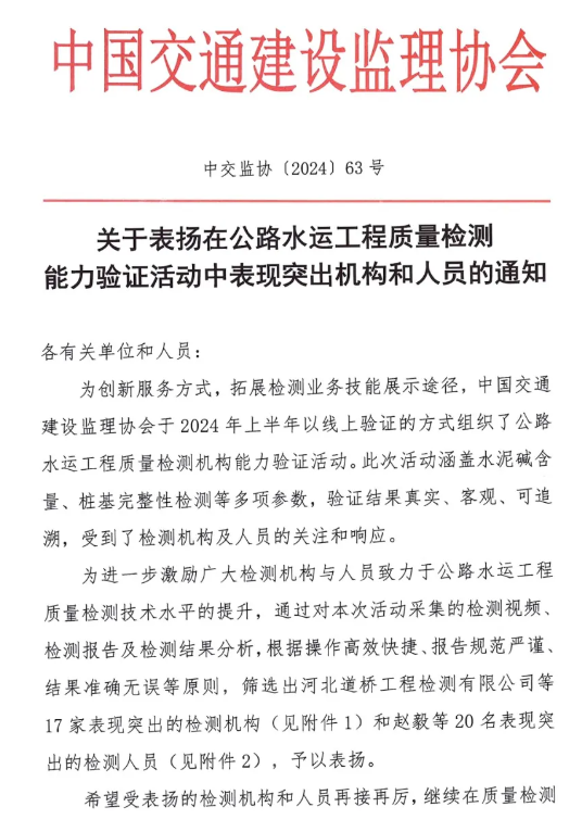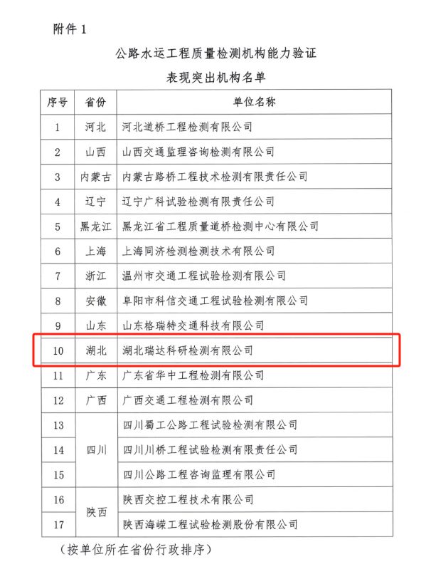 近日,中國交通建設(shè)監(jiān)理協(xié)會(huì)發(fā)布《關(guān)于表揚(yáng)在公路水運(yùn)工程質(zhì)量檢測能力驗(yàn)證活動(dòng)中表現(xiàn)突出機(jī)構(gòu)和人員的通知》,湖北路橋旗下的瑞達(dá)檢測公司榮獲“表現(xiàn)突出機(jī)構(gòu)”稱號(hào),且是湖北省內(nèi)唯一獲得表彰的檢測單位。