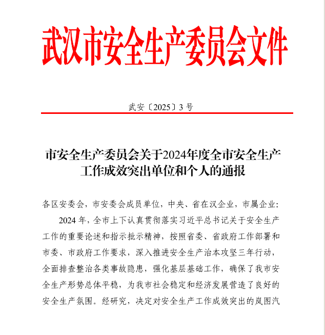 近日,武漢市安全生產(chǎn)委員會發(fā)布《關(guān)于2024年度全市安全生產(chǎn)工作成效突出單位和個人的通報》,華晟通公司榮獲武漢市2024年度安全生產(chǎn)工作“優(yōu)秀集體”稱號,黨總支書記、董事長凡孝均獲評武漢市2024年度安全生產(chǎn)工作“優(yōu)秀個人”榮譽。