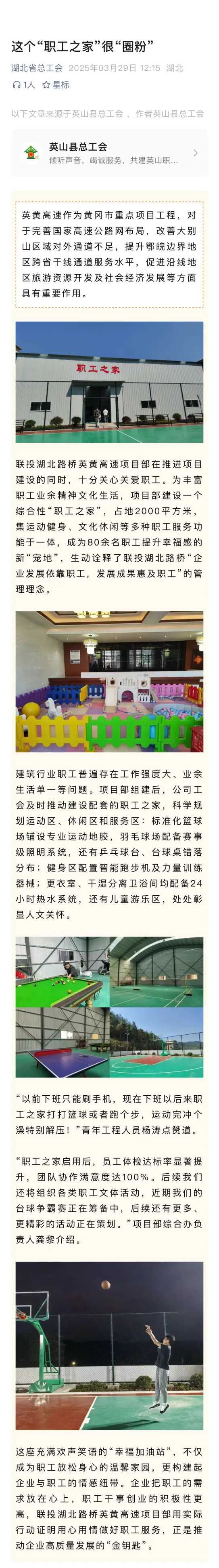 聯(lián)投湖北路橋英黃高速項(xiàng)目部在推進(jìn)項(xiàng)目建設(shè)的同時(shí),十分關(guān)心關(guān)愛職工。為豐富職工業(yè)余精神文化生活,項(xiàng)目部建設(shè)一個(gè)綜合性“職工之家”,占地2000平方米,集運(yùn)動(dòng)健身、文化休閑等多種職工服務(wù)功能于一體,成為80余名職工提升幸福感的新“寵地”,生動(dòng)詮釋了聯(lián)投湖北路橋“企業(yè)發(fā)展依靠職工,發(fā)展成果惠及職工”的管理理念。近日,湖北省總工會(huì)進(jìn)行深入報(bào)道,全文如下: