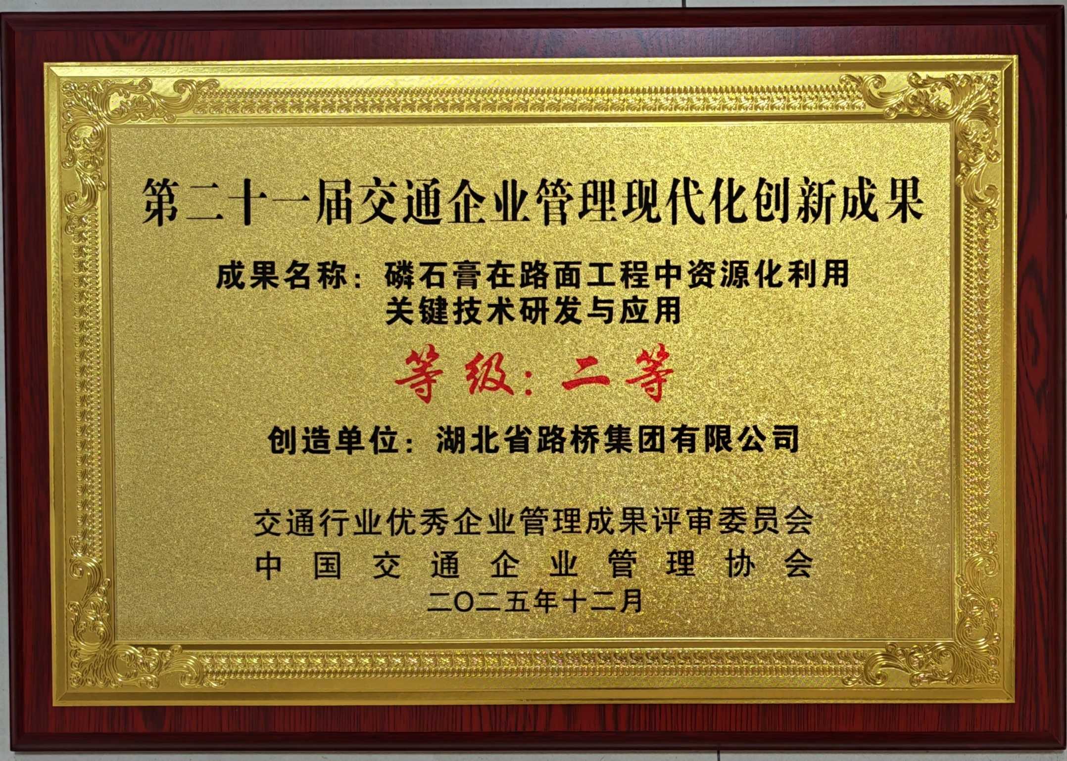 近日,由中國交通企業(yè)管理協(xié)會主辦的第二十一屆交通企業(yè)管理創(chuàng)新成果發(fā)布會在廣州順利召開,湖北路橋申報的《磷石膏在路面工程中資源化利用關(guān)鍵技術(shù)研發(fā)與應用》憑借突出的技術(shù)創(chuàng)新性、顯著的環(huán)保效益與廣闊的推廣應用前景,在眾多參評成果中脫穎而出,成功斬獲“第二十一屆交通企業(yè)管理現(xiàn)代化創(chuàng)新成果”二等獎。這一榮譽不僅是對湖北路橋在工業(yè)固廢資源化利用領(lǐng)域技術(shù)實力的高度認可,也標志著我國在工業(yè)固廢大規(guī)模資源化應用于交通基礎(chǔ)設(shè)施建設(shè)方面取得了又一重要突破。