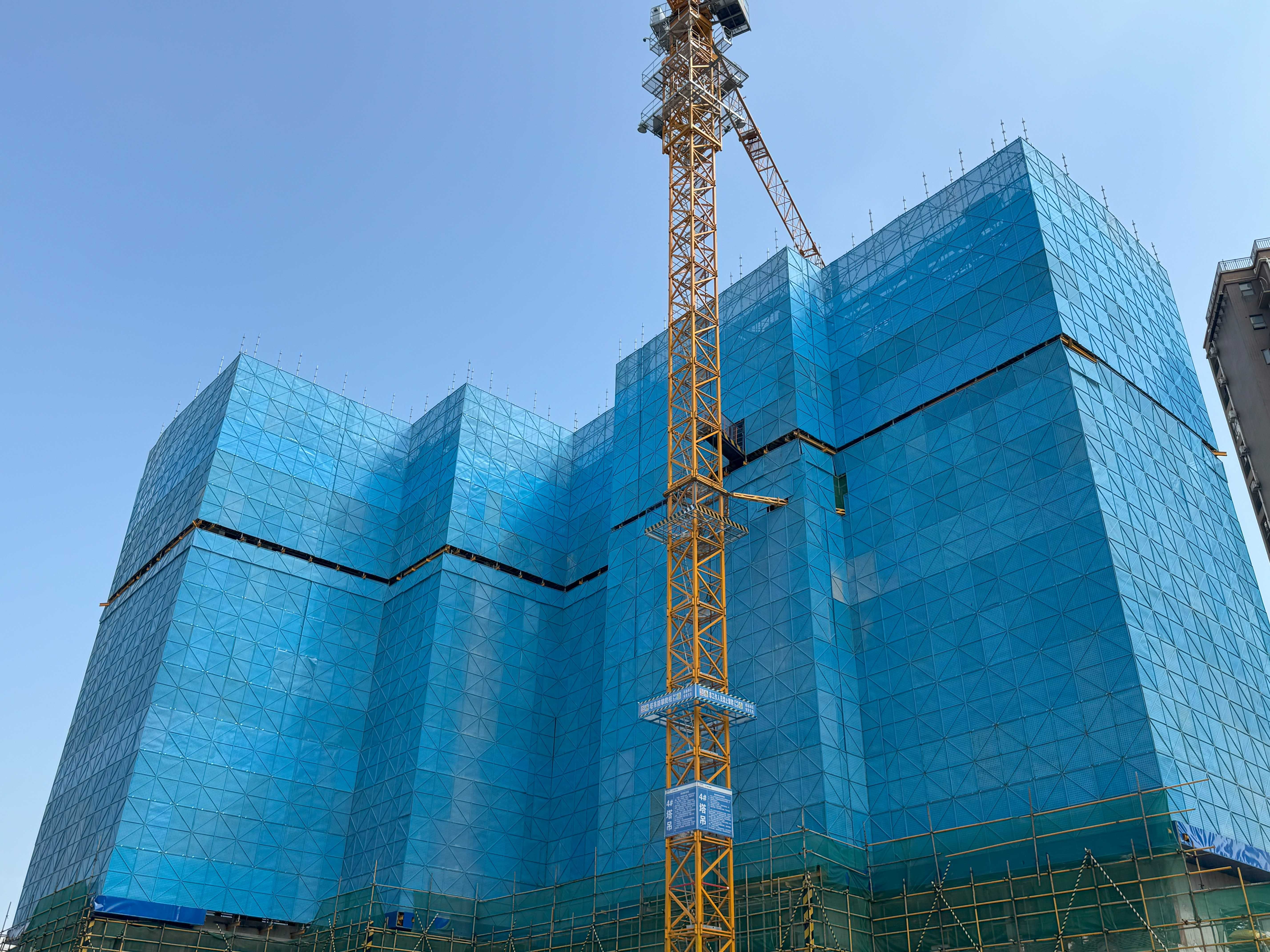 走進(jìn)施工現(xiàn)場,極目新聞記者看到,在建的5棟高層建筑外立面上采用藍(lán)色的花籃懸挑腳手架,既美觀又安全。?