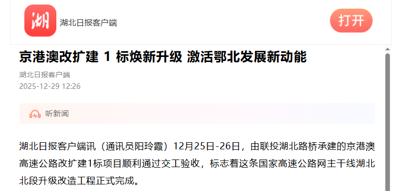 近日,聯(lián)投湖北路橋京港澳高速公路改擴(kuò)建1標(biāo)項(xiàng)目順利通過交工驗(yàn)收,湖北日報(bào)對這一重大節(jié)點(diǎn)進(jìn)行報(bào)道,以下是報(bào)道全文: